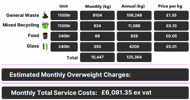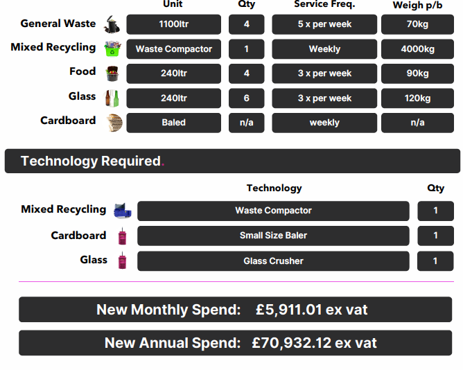 Taking into account the improvements that are required in conjunction with our analysis of your current services and data, we have designed a solution that achieves the desired outcome of increased recycling, improved environmental performance and cost reduction. Below we have detailed your new solution.