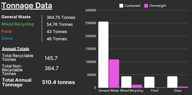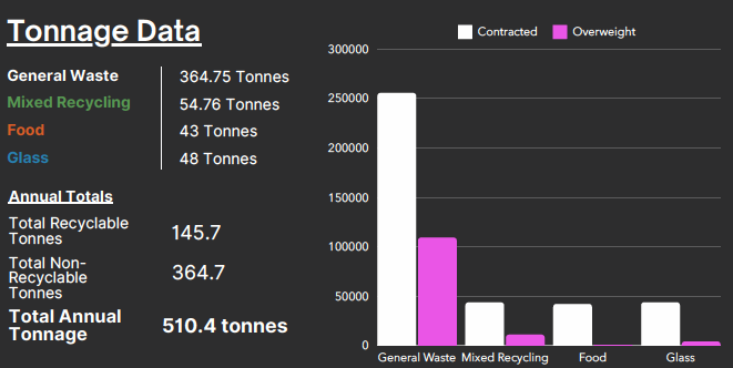 On review, Glass Waste is the one waste stream onsite that rarely goes overweight. We feel this is due to the large quantity of air volume within uncrushed glass bins.